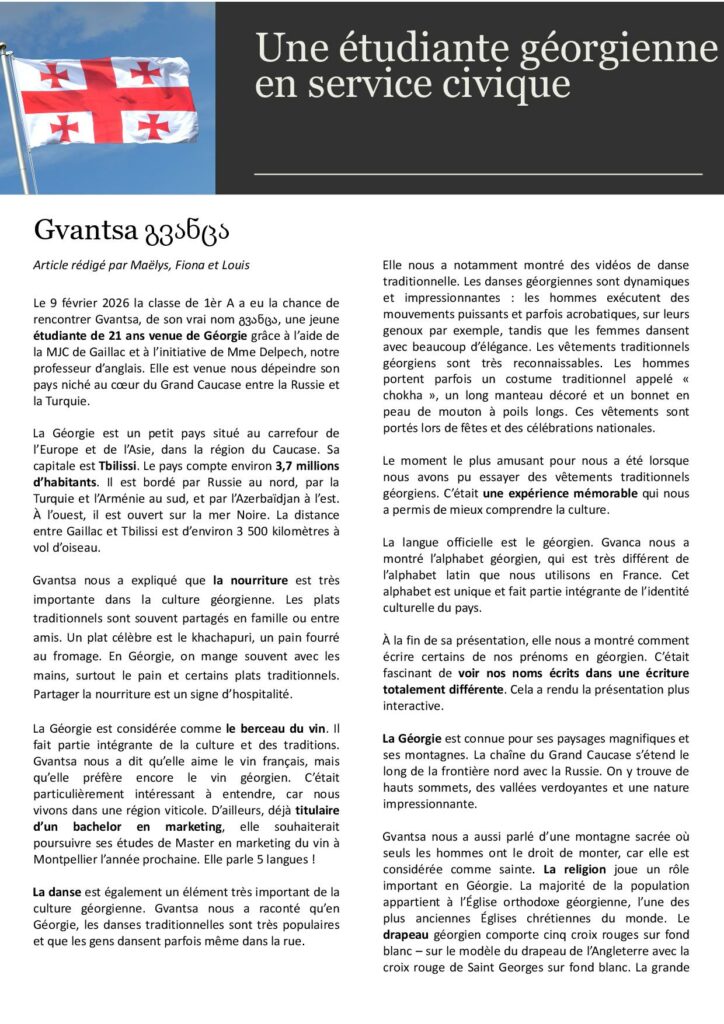 Rencontre avec Gvansta, jeune en service civique européen de Géorgie. Auteur/autrice de la publication :Laure CARAVACA Publication publiée :13 avril 2026 Post category:Activités Pédagogiques / Actualités / AMC / Anglais / Animation Pastorale et Culturelle / Partenariat Commentaires de la publication :0 commentaire Diaporama élaboré et présenté par Gvansta Étiquettes: amc, anglais, Animation, Géorgie, Lycée, MJC Gaillac, Partenariat MJC Please Share This Partager ce contenu Ouvrir dans une autre fenêtre Ouvrir dans une autre fenêtre Ouvrir dans une autre fenêtre Ouvrir dans une autre fenêtre Ouvrir dans une autre fenêtre Ouvrir dans une autre fenêtre Ouvrir dans une autre fenêtre Ouvrir dans une autre fenêtre Ouvrir dans une autre fenêtre Ouvrir dans une autre fenêtre Read more articles Article précédentFestival Chuchote-moi ta poésie Vous devriez également aimer Les 1ères à Toulouse 22 janvier 2024 PEAC Info – Intox 23 avril 2024 Fête de la Saint Joseph 2023 18 avril 2023 Laisser un commentaire Annuler la réponseCommentEnter your name or username to comment Enter your email address to comment Saisir l’URL de votre site (facultatif) Enregistrer mon nom, mon e-mail et mon site dans le navigateur pour mon prochain commentaire.